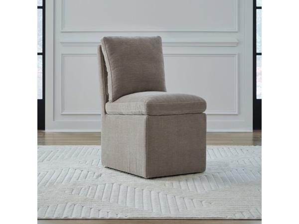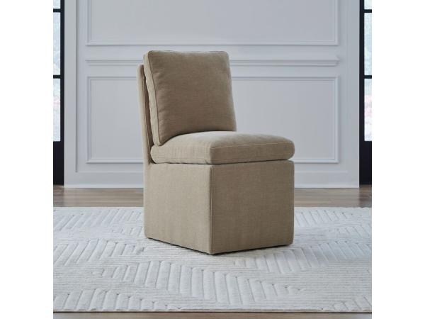 This versatile Truffle accent dining chair features full upholstery, pillowtop seat and back cushions, and casters for easy mobility. It provides comfort and sophistication, suitable for use as a dining, host, or accent chair.
