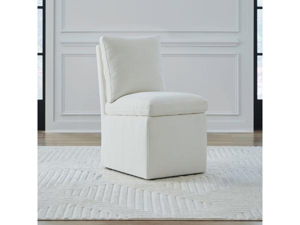 This versatile Ivory accent dining chair features full upholstery, pillowtop seat and back cushions, and casters for easy mobility. It provides comfort and sophistication, suitable for use as a dining, host, or accent chair.