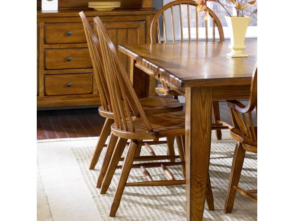 The Treasures sheaf back side chair, crafted from rubberwood solids with a rustic oak finish, features comfortable saddle-shaped seating, H-shaped stretchers for support, and nylon floor glides.