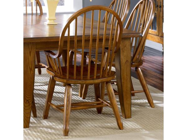 This Treasures bow back arm chair is crafted from rubberwood solids with a rustic oak finish, featuring a saddle-shaped seat for comfort. It includes nylon chair glides to protect flooring.