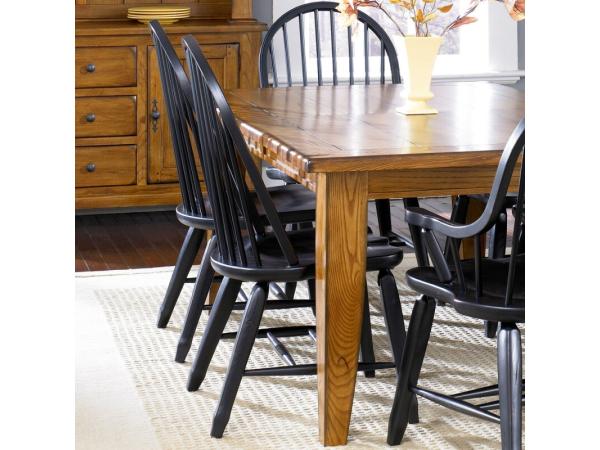 The Double Bridge gathering tabletop is made from rubberwood solids and acacia veneers, finished in dark chestnut. It includes two 12-inch leaves for expanding the table surface.