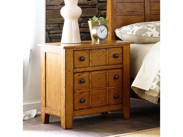 This rustic American night stand is crafted from select hardwoods and oak veneers with an aged oak finish. It features two drawers with French & English dovetail construction, complete dust proofing, and antique brass knob hardware.