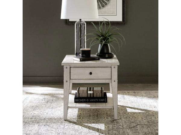 Crafted from Poplar solids and Oak veneers with a Weathered White finish, this Lake House end table features a planked top, a bottom shelf, and a storage drawer with Antique Brass hardware. It boasts a multi-step hand-applied finish and tapered legs.
