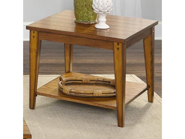 This Lake House end table, made from poplar solids and oak veneers with an oak finish, features a planked top and wood accents. It includes a bottom shelf and a drawer with antiqued brass hardware for storage.