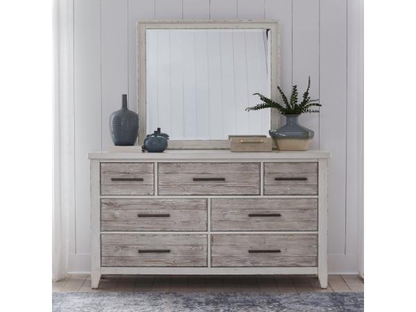 The Farmhouse server, crafted from rubberwood solids and veneers, offers ample storage with two felt-lined drawers and shelving. It features a heavy distressing, diagonal slat accents, wood drawer glides, a solid wood top, and a two-tone white finish with