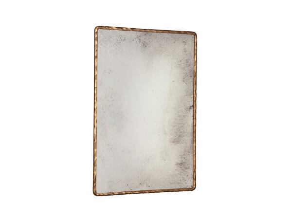 Antiqued mirror with hammered gold edge. Simplistic and beautiful. A french cleat mechanism is included for your ease of hanging.