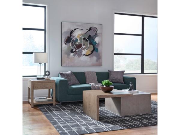 This modern end table blends industrial style and function with a faux concrete insert on the top, a single storage drawer, and an open bottom shelf. It is crafted from Rubberwood solids and White Oak veneers.