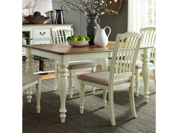 The Cumberland Creek rectangular leg table features a two-tone buttermilk and nutmeg finish, crafted from rubberwood and cashew solids with white oak veneers. It includes an 18-inch removable leaf and fluted legs, ideal for farmhouse dining.