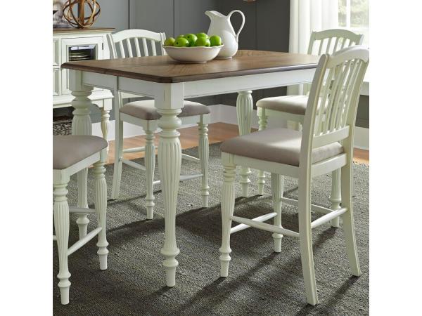 This Cumberland Creek counter chair is crafted from rubberwood solids with a buttermilk finish and features a padded seat in gray linen upholstery. It has a slat back design and includes nylon chair glides to protect flooring.