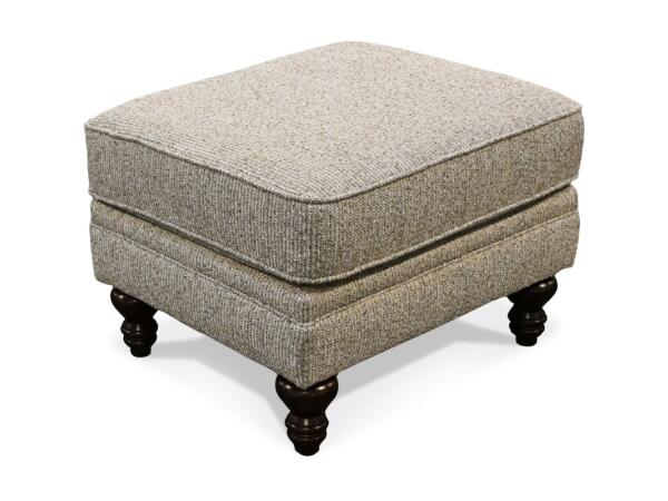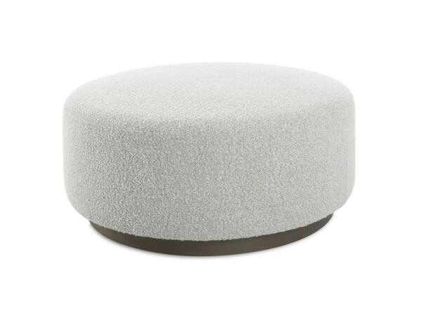 This plush ottoman is covered in a casual ivory and warm gray boucle fabric with a natural walnut stained oak