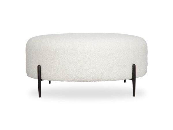 This plush ottoman is covered in a luxurious white faux shearling, suspended within satin black finished metal legs. Versatile and