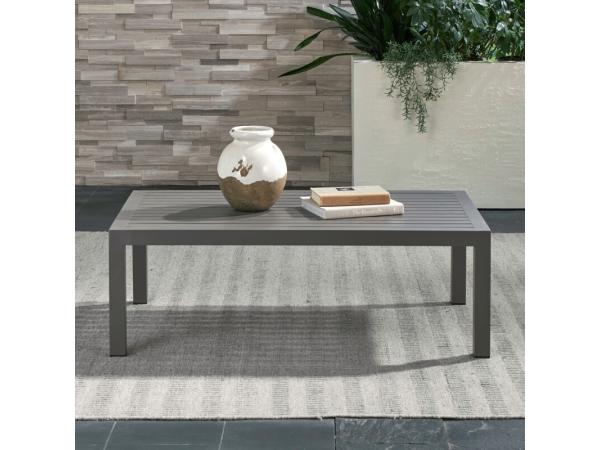 This Plantation Key outdoor cocktail table features a weather and rust-resistant Cast Aluminum construction with a Granite finish. It offers a unique slatted top and clean square block legs, perfect for outdoor entertaining.