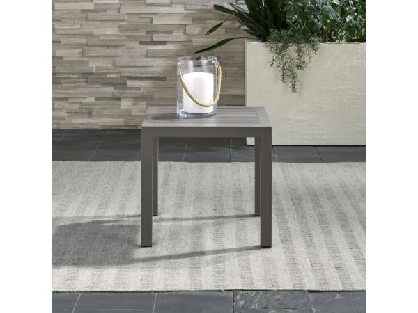 This Plantation Key outdoor end table features weather and rust-resistant Cast Aluminum construction with a Granite finish. It boasts a slatted top that flows into square block legs, perfect for convenient outdoor use.