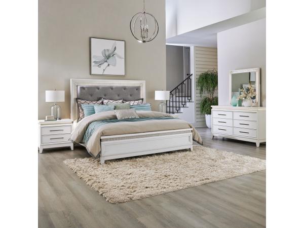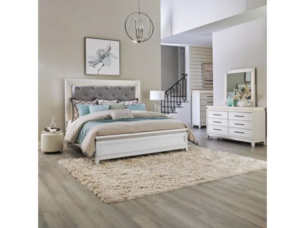 King California Uph Bed, Dresser & Mirror, Chest, Night Stand