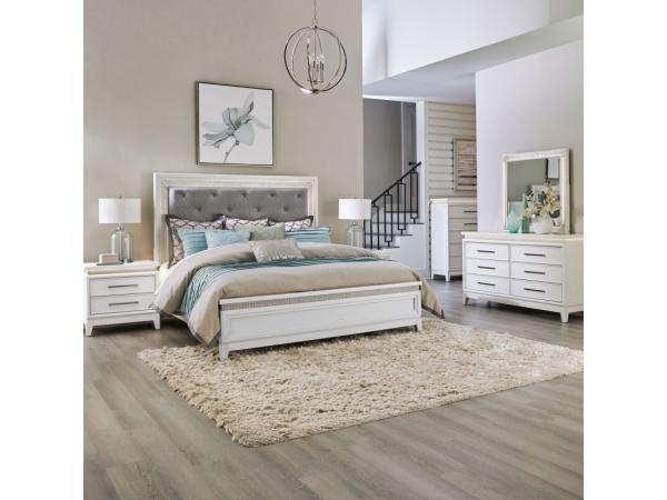King Uph Panel HB w/ Lights,King Panel Footboard,Panel Bed Rails,6 Drawer Dresser w/ Lights,Lighted Mirror,5 Drawer Chest w/ Lights,Nightstand w/ Lights and Charging Station