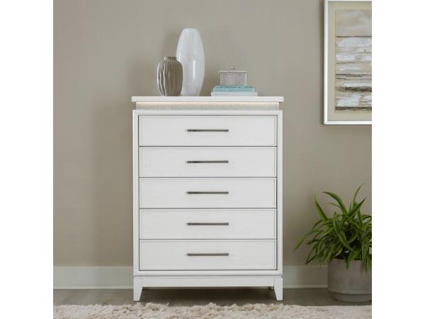 This 5-drawer chest is crafted from Rubberwood solids and Paper Laminate with a Pearl White finish. It features a floating style top, rhinestone apron, and touch-activated LED lighting for a touch of sparkle.