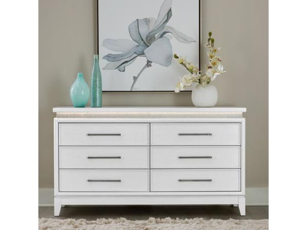 This 6-drawer dresser is crafted from Rubberwood solids with a Pearl White finish and rhinestone accents. It features a floating style top, touch-activated LED lighting, and satin nickel bar pull hardware for a modern look.