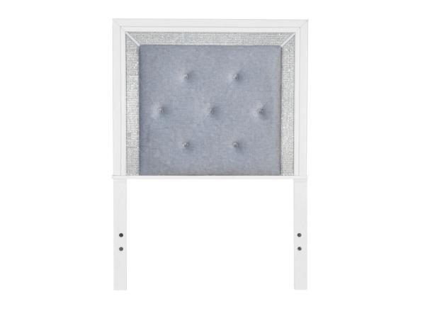 This twin upholstered panel headboard is crafted from Rubberwood solids in a Pearl White finish. It features a button-tufted Gray Chenille panel, touch-activated LED lighting, and sparkling rhinestone accents.