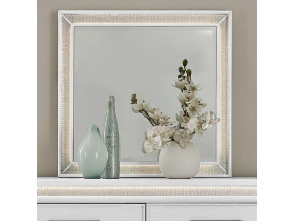 Crafted from Rubberwood solids with a Pearl White finish, this lighted mirror features a floating style with rounded picture frame molding. It includes rhinestone accents and touch-activated LED lighting and comes with bolt-on supports for dresser attachm