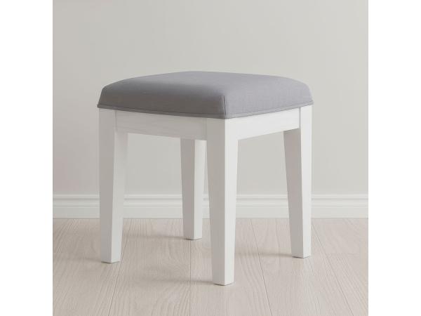 This vanity stool features a padded seat with Grey Chenille upholstery for comfort. It is designed with square tapered legs and includes nylon chair glides to protect floors.