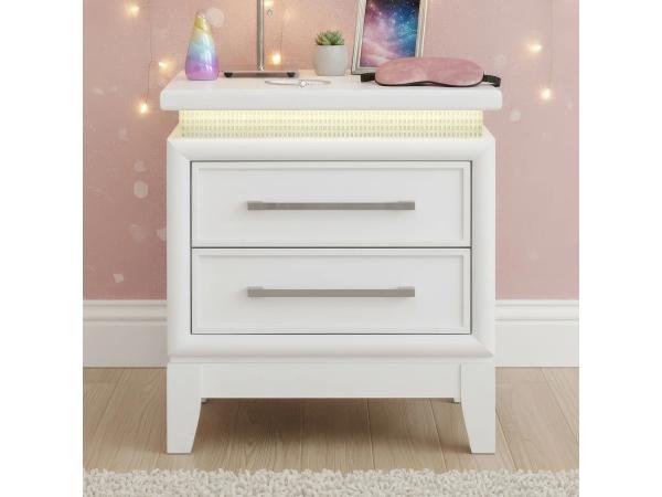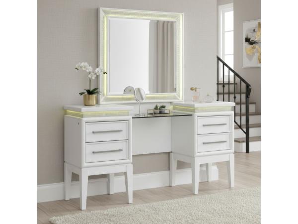 This bedroom vanity features two pedestals with a rhinestone apron and touch-activated LED lighting. It is detailed with bead-molded drawer fronts, tapered legs, and satin nickel bar pull hardware.