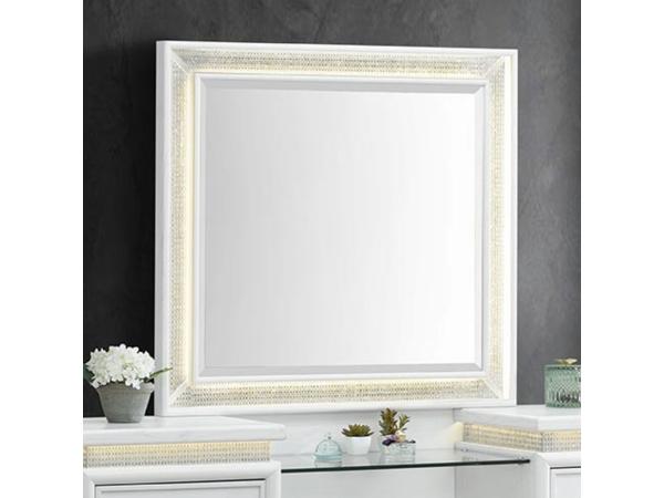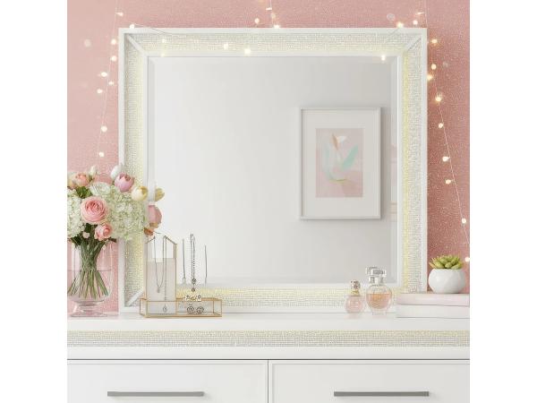 This vanity mirror features rounded picture frame molding, rhinestone accents, and touch-activated LED lighting. It has a 1-inch beveled edge and ships with a back panel and center glass shelf for vanity setup.