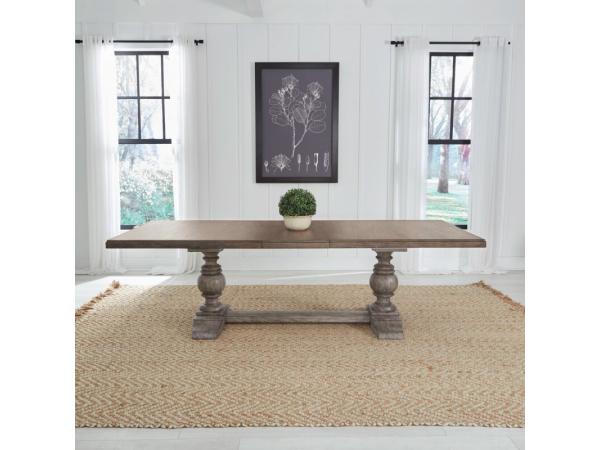 This River Place trestle table base is crafted from Pine solids and veneers with a distressed Riverstone Grey finish. It features two heavy, multi-turned pedestals, shaped bracket feet, and a center trestle for stability.