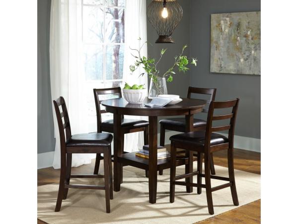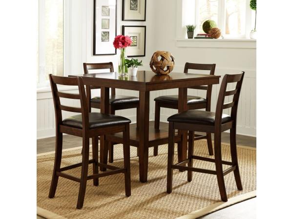 This 5-piece gathering table set includes a 40x40-inch table with a built-in storage base. It comes with four contemporary ladderback counter chairs featuring comfortable black vinyl upholstered seats.