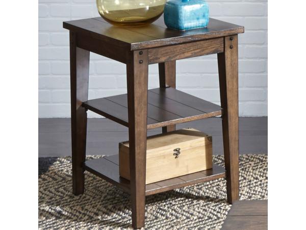 Crafted from poplar solids and oak veneers with a rustic brown oak finish, this chair side table features an appealing planked top and tapered legs. It provides one drawer with antiqued brass hardware and two shelves for storage and display.