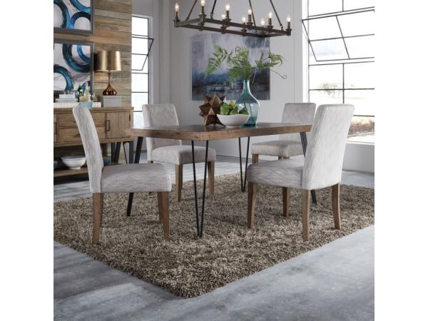 The Horizons upholstered side chair features rubberwood solids, a rustic caramel finish with saw mark distressing, and cream linen upholstery. It includes nylon chair glides for floor protection.