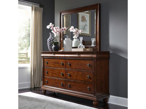 This Rustic Traditions 8-drawer dresser is crafted from poplar solids and pin knotty cherry veneers with a rustic cherry finish. It provides ample storage with 6 large and 2 smaller drawers, including a felt-lined top drawer.