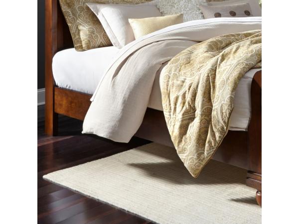 This complete bedroom set includes a King California panel bed, dresser, mirror, chest, and nightstand. The collection features classic details like bun feet, bead molding, and antique brass drop ring hardware.