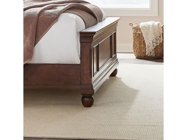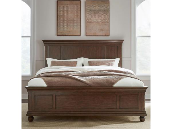 This King California panel bed showcases traditional design with a heavy top crown on the headboard and a wide cap rail on the footboard. Detailed with bead molding, chamfered pilasters, and bun feet for a classic look.
