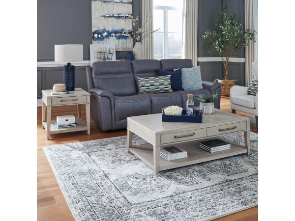 This 3-piece living room set includes a rectangular cocktail table on casters and two end tables for a complete look. The set features fancy face veneer tabletops, flat front storage drawers, and champagne silver bar pull hardware.