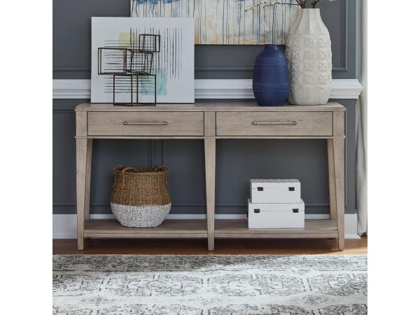 This sofa table features a fancy face veneer top and square tapered legs. It includes two storage drawers with champagne silver bar pull hardware and an open bottom shelf for display.