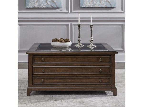 This Arden Road square collector cocktail table is crafted from Poplar solids and Rustic Alder veneers with a Satin Cherry finish. It features a wood framed glass top for displaying collectibles, a felt-lined top drawer, and a large bottom drawer with a b