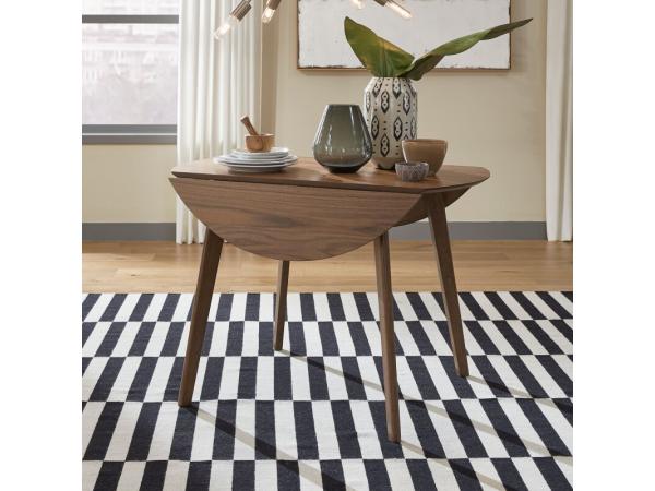 This drop leaf table is crafted from rubberwood solids and walnut veneers with a satin walnut finish. It features two 9-inch drop leaves to accommodate guests and splayed angled legs.