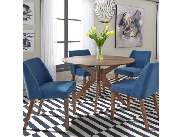 This gathering table features durable rubberwood solids and walnut veneers with a satin walnut finish and a fixed round top. It includes an "X" style center stretcher and unique splayed legs.