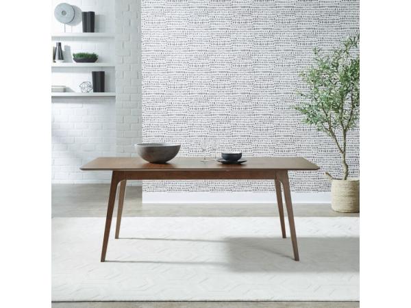 The Space Savers rectangular leg table is crafted from Rubberwood solids and Walnut veneers with a Satin Walnut finish, featuring a 15-inch butterfly leaf for expanded dining. Its Mid-Century Modern design includes softly rounded corners and splayed taper