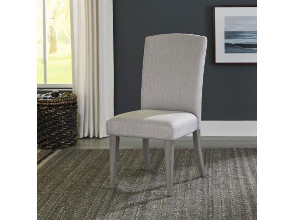 This Palmetto Heights upholstered side chair boasts a full back and seat in 100% polyester grey linen fabric, crafted from rubberwood solids. It features tapered legs with a Driftwood finish and protective nylon chair glides.