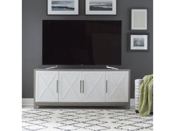 This 78-inch Palmetto Heights TV console features a two-tone Driftwood and Shell White finish, crafted from rubberwood solids and white oak veneers. It includes four wood framed doors with X-pattern overlay, soft-close hinges, adjustable shelves, and wire