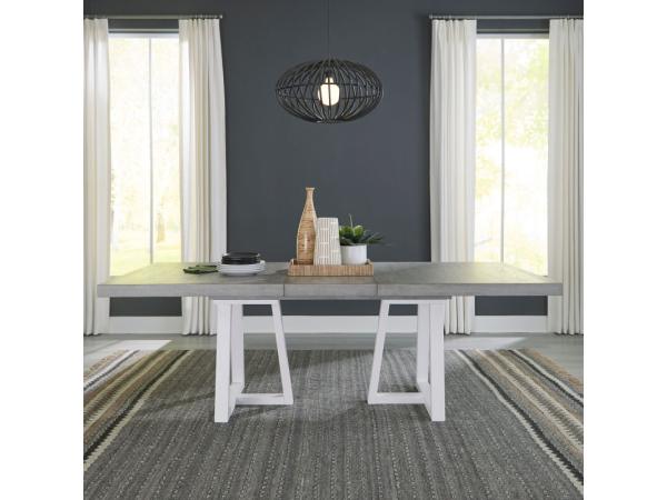 This Palmetto Heights double pedestal table base, crafted from rubberwood solids, features a Shell White finish. It provides openness and clean lines, perfect for a contemporary dining space.