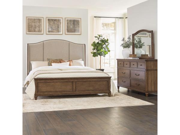 This King shelter bed set, including a dresser and mirror, features frosted beige upholstery and antique brass bail & knob hardware. The dresser offers metal side drawer guides, premium felt-lined top drawers, and cedar-lined bottom drawers.