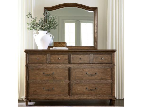This dresser and mirror set features softly rounded pilasters and elegant turned feet. The dresser includes premium felt-lined top drawers and cedar-lined bottom drawers, complemented by a beveled mirror.