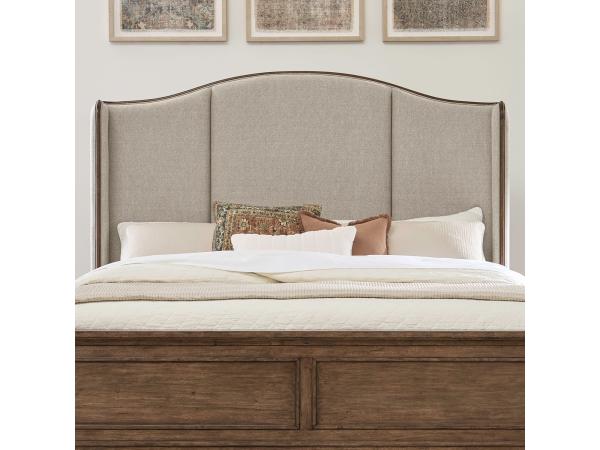 Enhance your bedroom with this queen shelter headboard, featuring an arched design with channeled upholstered panels in frosted beige. Elegant wood frame accents complete the sophisticated look.