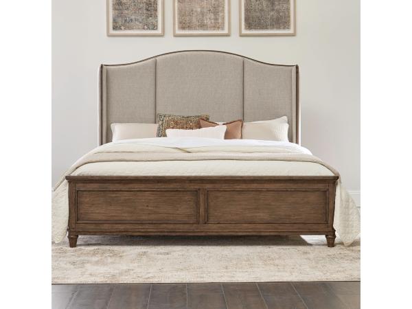 This King Shelter Bed features frosted beige upholstery, an arched upholstered shelter headboard, and elegant wood frame accents. Design details include channeled panels, a softly rounded cap rail, round pilasters, turned feet, and square bead molding.