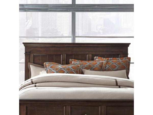 This Saddlebrook queen panel headboard features a transitional style with heavy cap molding and a planked design. Crafted from rubberwood solids with birch veneers, it offers a tobacco finish to complement various bedroom decors.