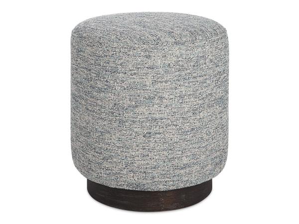This plush ottoman is covered in a casual ivory and warm gray boucle fabric with a natural walnut stained oak