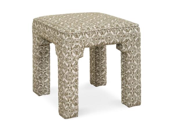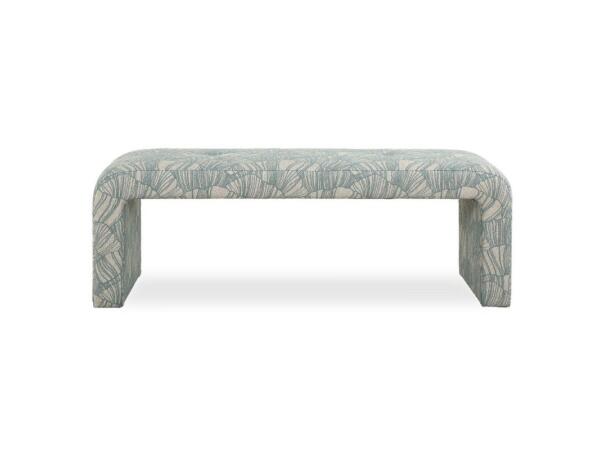 This chic, modern bench is fully upholstered in a graphically inspired shell print in spa blue, offering a clean look