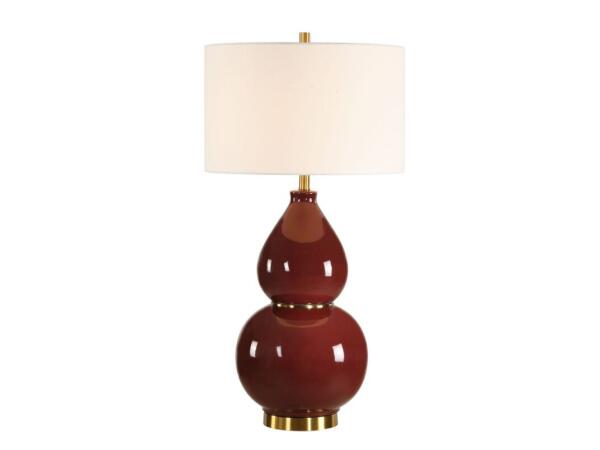 This timeless gourd shaped ceramic base is finished in a deep burgundy glaze accented with lightly antiqued brass plated details.